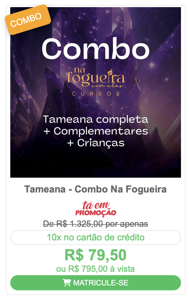 Ao adquirir o combo completo, você não só aprende Tameana, uma poderosa técnica vibracional canalizada pelos Pleiadianos, como também recebe os cursos complementares de símbolos e Tameana para crianças, ampliando seu campo de atuação e aprofundando sua conexão com a frequência.